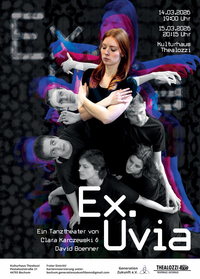 Mit der Tanztheaterproduktion „Ex.Uvia“ bringen wir als Bochumer Ortsgruppe von Generation Zukunft e.V. erstmals ein eigenständig entwickeltes Tanztheaterstück auf die Bühne. Das etwa einstündige Stück verbindet choreografierten Tanz, bekannte Popsongs und lyrische Texte zu einer zusammenhängenden Bühnenhandlung.