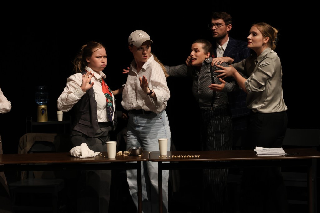 Das Kammerspiel, in dem sich alle zwölf Darstellende durchgehend auf der Bühne befinden, hat uns in der Erarbeitung vor einige organisatorische Herausforderungen gestellt. Doch durch einen sehr durchdachten Probenplan und ein großes Engagement des ganzen Ensembles wurde die viermonatige Probenzeit für die weiter gewachsene Ortsgruppe erneut zu einer lustigen und kreativen Zeit neben dem Beruf oder dem Studium.